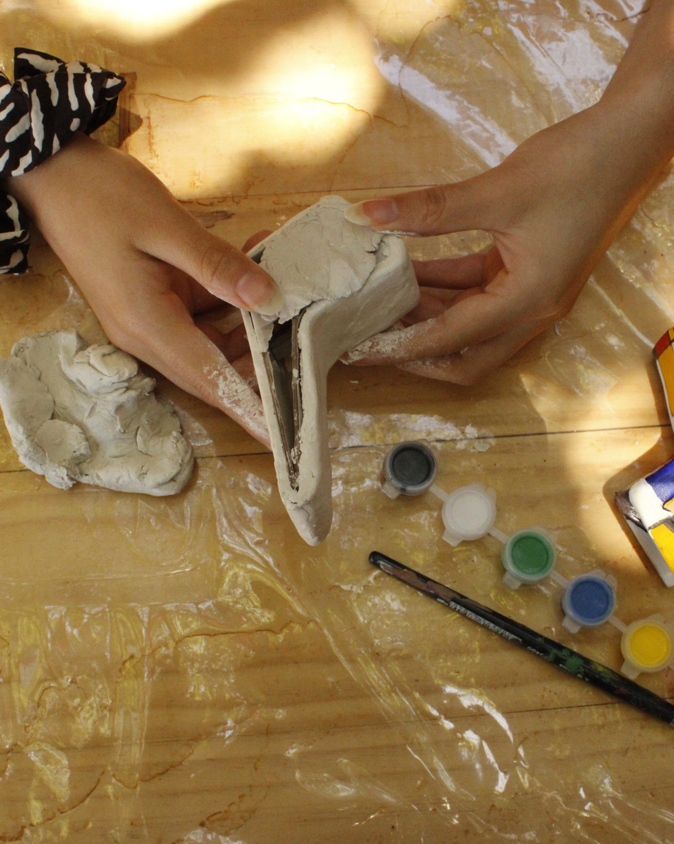 Materiales que usaremos: masa das, base de trabajo, elementos decorativos simples, estecas, hojas, lápiz grafito, etc.